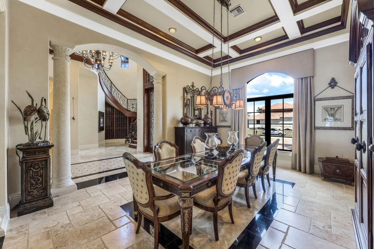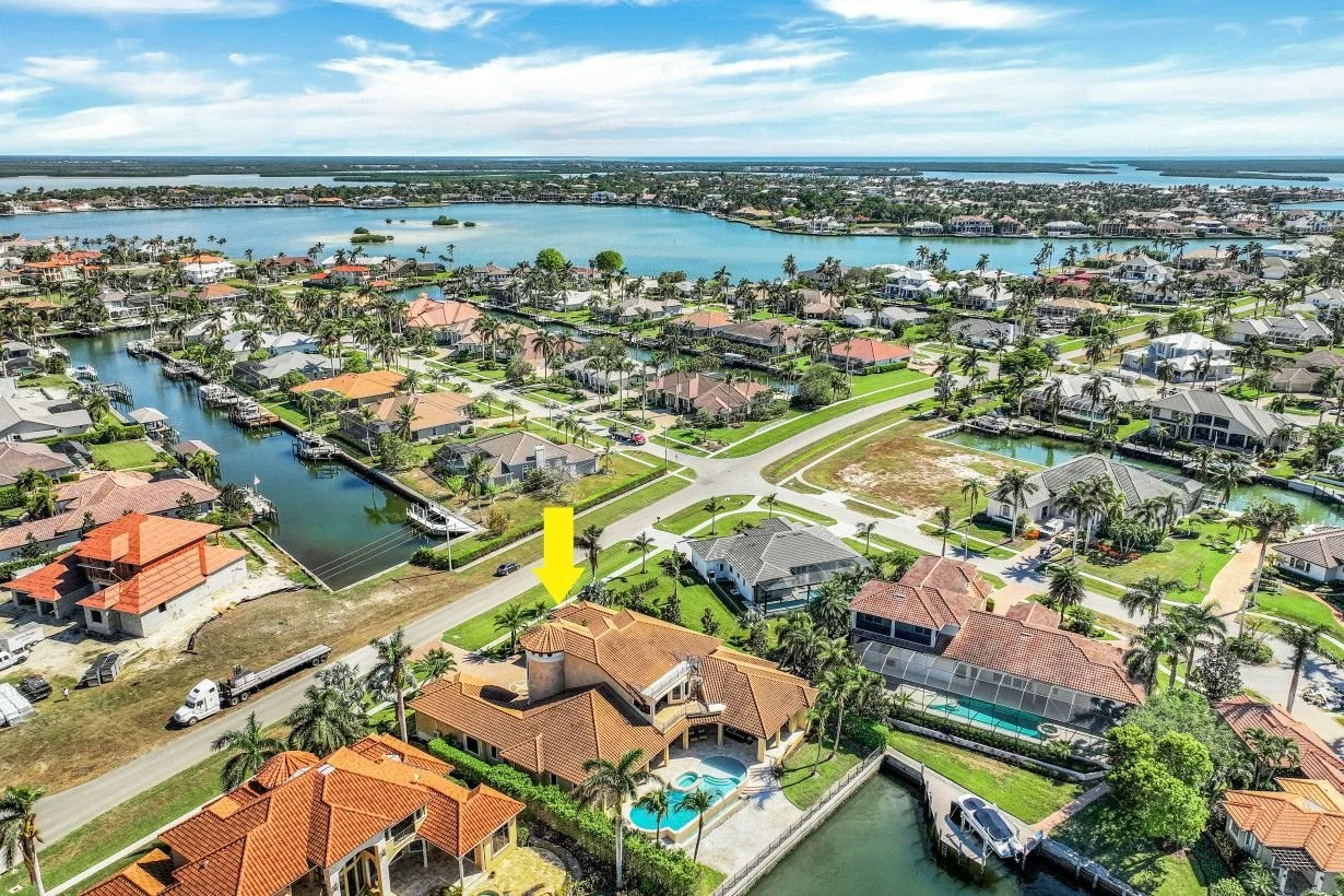 Nestled within Marco Island's prestigious Estates section, this custom-built waterfront residence boasts 5 bedrooms and 7 baths, showcasing exquisite craftsmanship and architectural splendor. As you step inside, the grandeur welcomes you, from the two-story cupola adorned with chandeliers at the foyer to the expansive built-in wine nook beneath the majestic circular marble stairway, setting the tone for an extraordinary living experience.