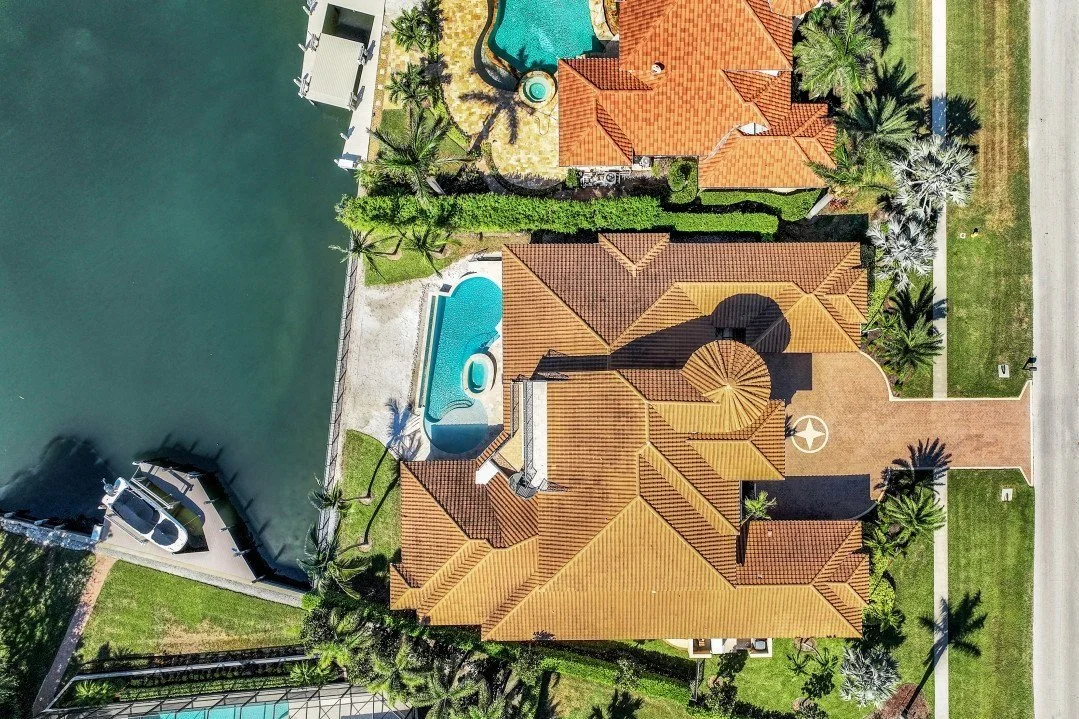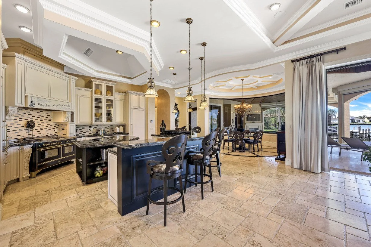 Most notable is the volume of space in the open living areas with a statement fireplace and beautiful tray ceiling, Gourmet Chef’s kitchen with double islands, custom gas range, an elegant formal dining room featuring box beam ceilings, and the waterfront breakfast area surrounded by seamless bay windows, with natural stone inlaid floors throughout. Sliding walls with electric screens and shutters and a whole house generator make this a quintessential Florida indoor/outdoor lifestyle home.