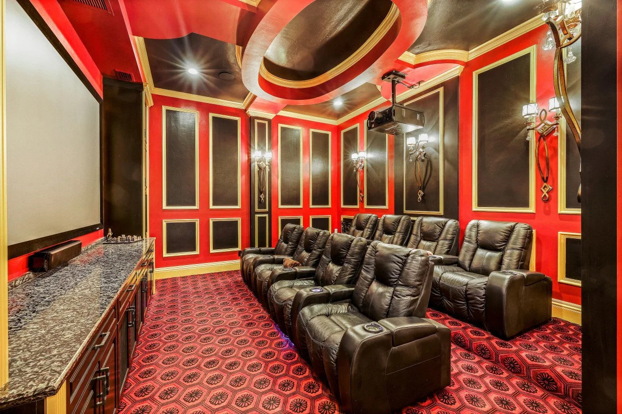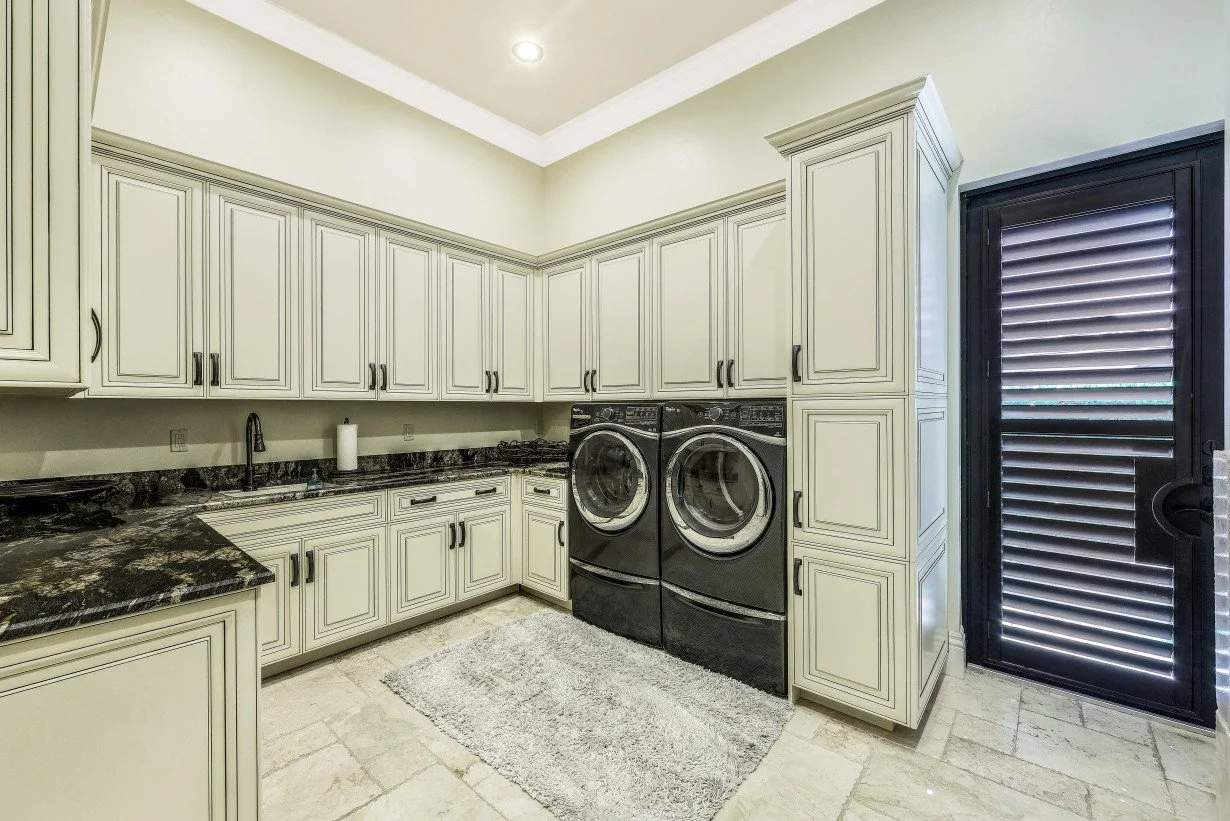 To complete the first level, entertain friends and family in the plush home theater with professional projector, make use of the charming built-in butler’s pantry with floor to ceiling black laquer cabinets,, plus a separate full size walk-in pantry with custom shelving. A generously sized laundry room features 2 pet suites and pet wash stall with the elevator nearby to reach the 2nd level. A split 2nd ensuite bedroom makes for additional ground floor sleeping quarters.