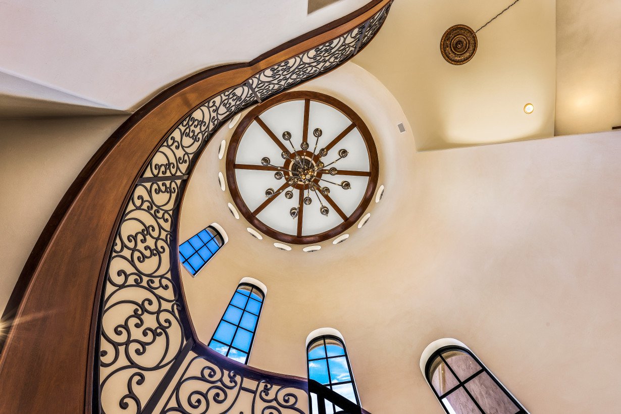 UPPER LEVEL | Accessed by elevator or the grand circular staircase, find 3 generous en suite bedrooms with tray ceilngs and crown moldings on the leisure level. 2 bedrooms feature spacious waterfront lanai’s with wide water views, and accessed from the lanai, is a charming outdoor wrought iron circular stair to a widows walk above. Perfect rooms for family members or special guests who are treated to privacy and luxury. A large, convenient air-conditioned owner’s storage room is located at the end of the hallway near the elevator.